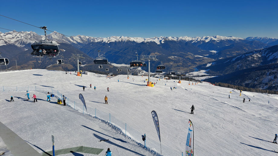 Wir gondeln wie in diesem Urlaub fast immer bei blauem Himmel zur Kronplatzspitze zu einer Festivität