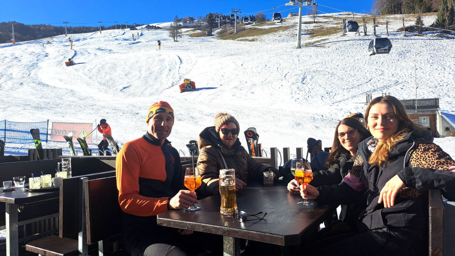 An der Talstation in Gassl treffen wir unsere fleißigen Skifahrer beim Doping - große Freude